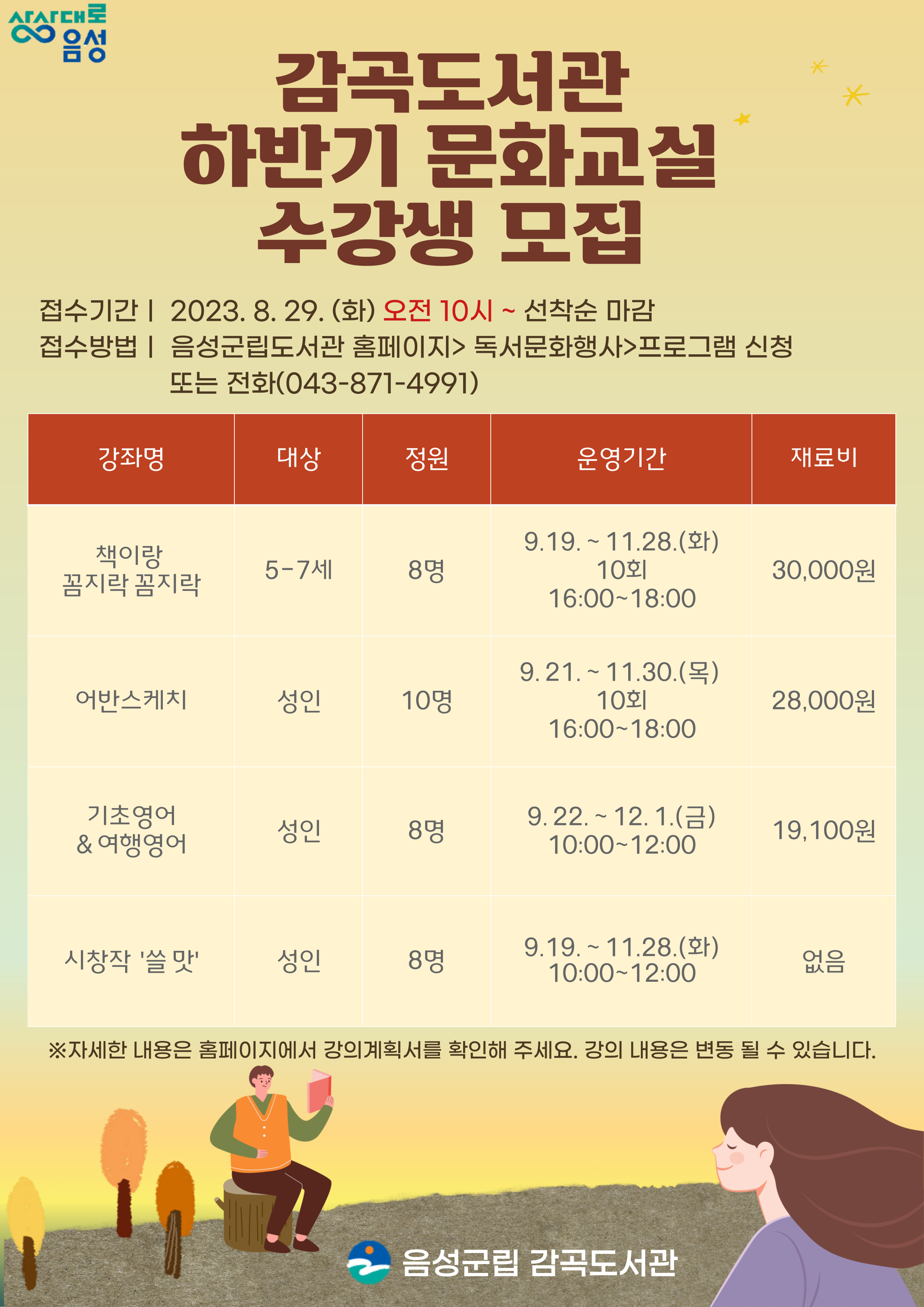 △맹동혁신도서관에서는 문화교실 강좌로‘독서대장 글쟁이 그림책’, ‘인문학으로 큐레이션하다’등 7강좌를 운영하고, △대소도서관에서는 ‘마음이음 푸드테라피’ 등 6강좌 △삼성도서관에서는 ‘가을 수채화 연필 풍경 스케치’등 3강좌를 운영하며, △감곡도서관에서는‘시 창작 쓸 맛’ 등 4강좌를 운영한다.
