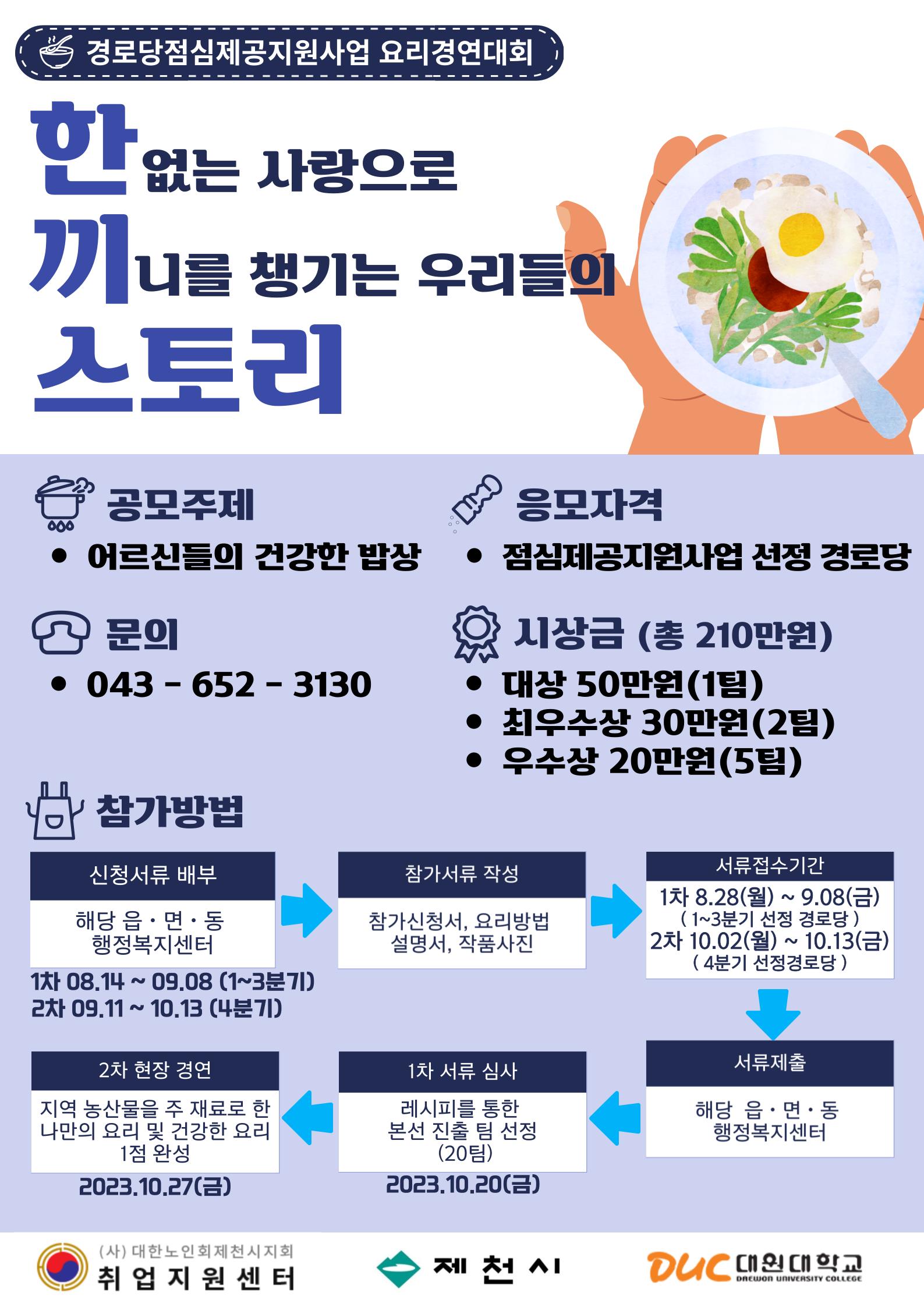 제천시는 민선8기 공약사업으로 추진중인“경로당점심제공지원사업”선정 경로당을 대상으로 대한노인회제천시지회(지회장 최동수) 주관‘경로당 한끼스토리’요리경연대회를 개최한다고 밝혔다.