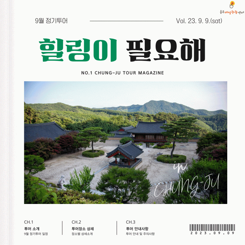 (재)충주중원문화재단체험관광팀(이하충주체험관광센터)이운영하고있는충주의대표관광프로그램인‘감성투어’가9월9일(토)에9월정기투어를운영한다.감성투어의정기투어는매월둘째주토요일에출발하는투어로…